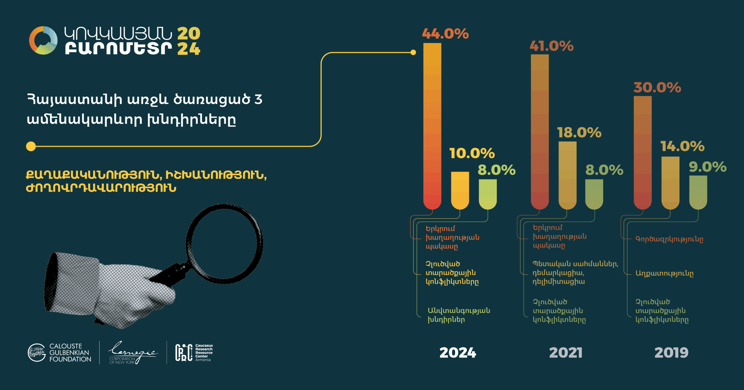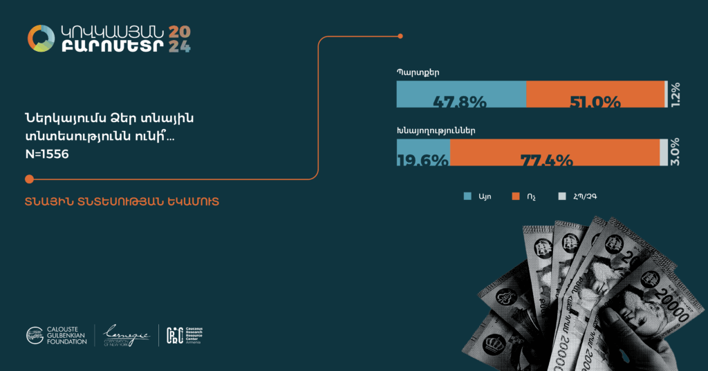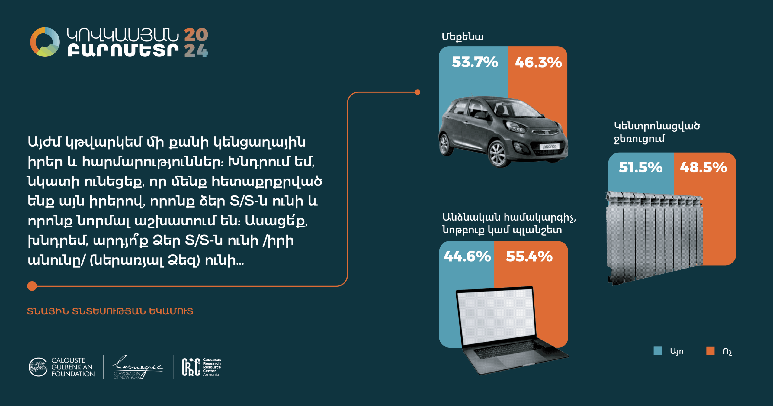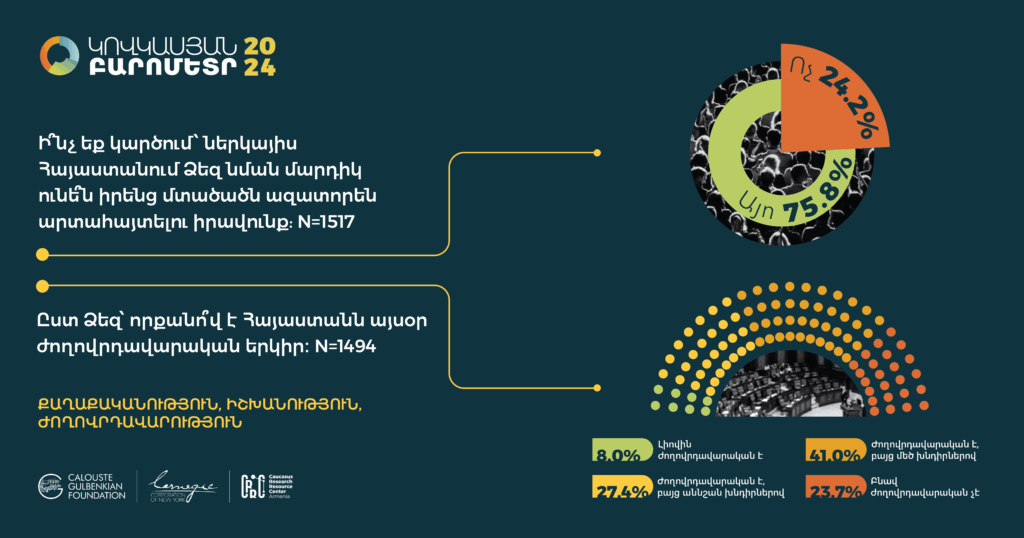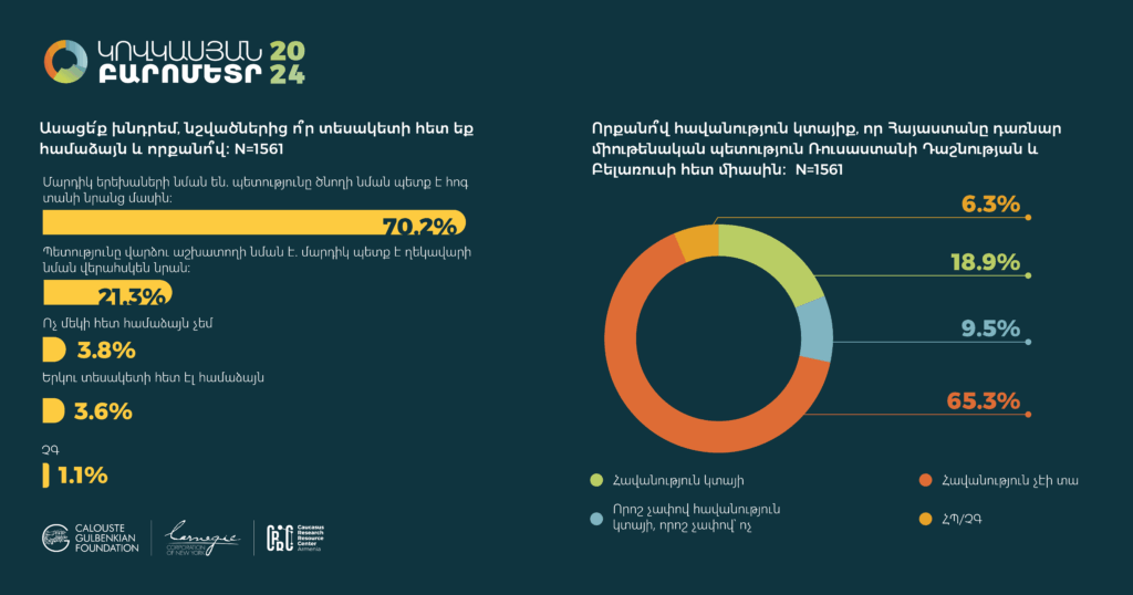Հարցման գործիքները` հարցաթերթերը, ցուցաքարտերը, ընտրանքի մեթոդաբանության մանրամասն նկարագրությունները, հավաքագրված տվյալների բազաները (SPSS/STATA ձևաչափերով) և դրանց վերլուծության որոշ նախնական արդյունքներ տեղակայված են մեր կայքումկամ Կովկասյան բարոմետրի տարածաշրջանային կայքում: Խնդրում ենք տվյալների վերաբերյալ հարցերով դիմել pmdi@crrc.am: Առցանց տվյալների վերլուծություն ՀՌԿԿ-ն վերջերս գործարկել է «Առցանց տվյալների վերլուծություն» (ԱՏՎ) հարթակը: Այս գործիքի միջոցով նույնիսկ տվյալների վերլուծության հմտություններ չունեցողները կկարողանան դիտել տվյալները և արդյունքներ ստանալ աղյուսակների տեսքով` առանց հատուկ ծրագրային փաթեթների և տվյալների շտեմարանների բեռնման: ԱՏՎ-ն հեշտ օգտագործվող գործիք է, որը չի պահանջում վիճակագրության իմացություն: Այս ուսուցանող տեսանյութը կօգնի որպեսզի կարողանաք ինքներդ վերլուծել առկա տվյալները և պատասխաններ ստանալ ձեզ հուզող հարցերին: