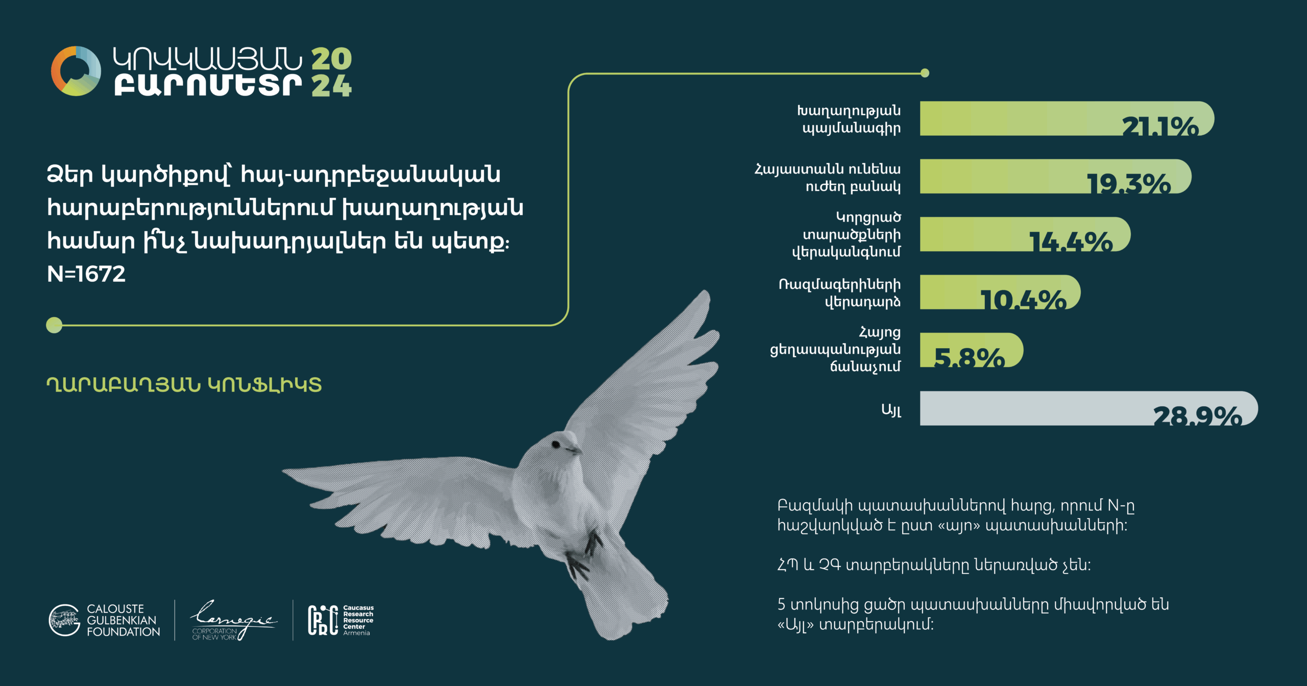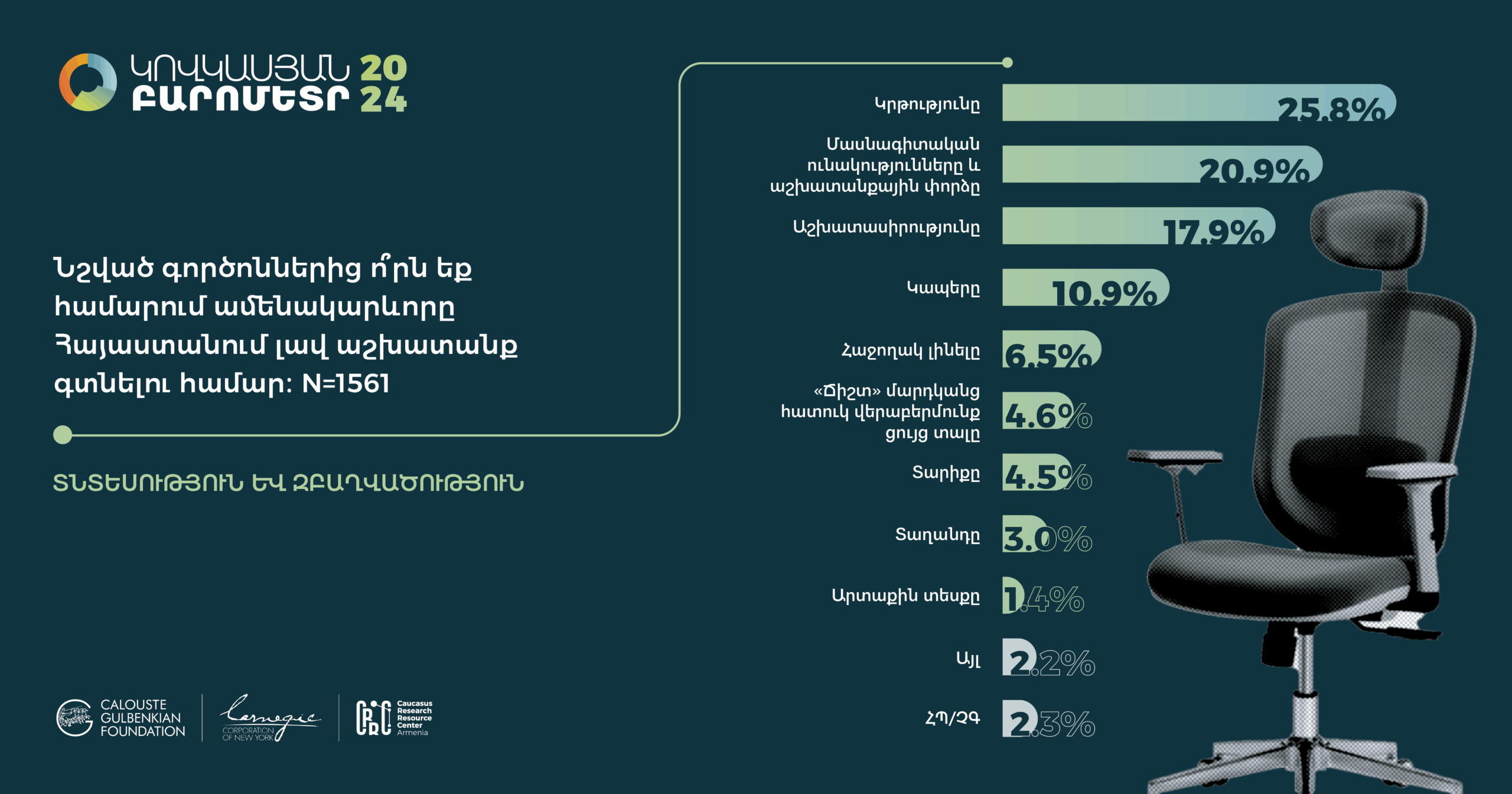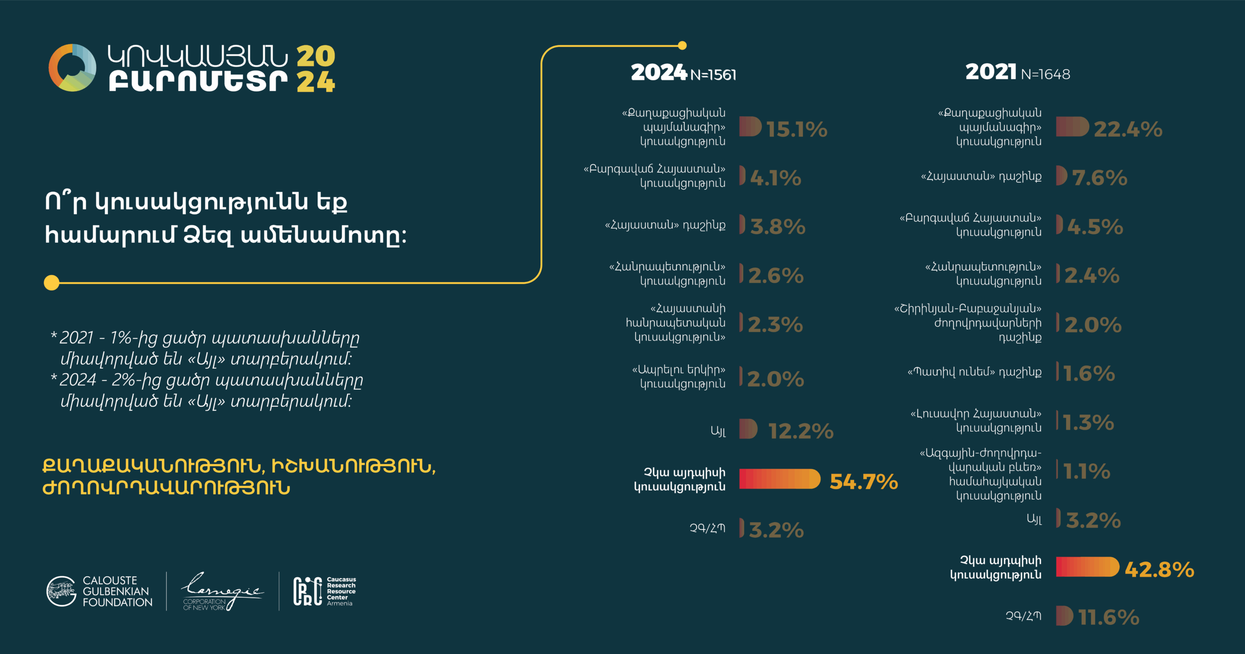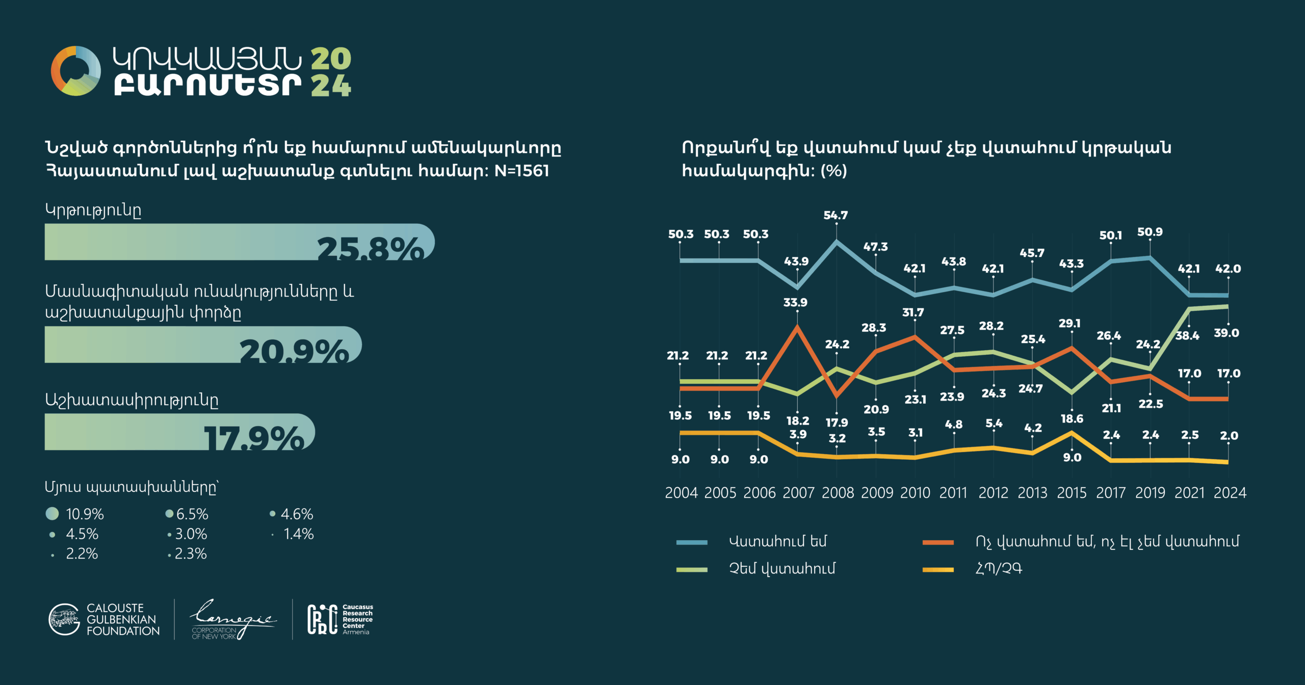 Հարցման գործիքները` հարցաթերթերը, ցուցաքարտերը, ընտրանքի մեթոդաբանության մանրամասն նկարագրությունները, հավաքագրված տվյալների բազաները (SPSS/STATA ձևաչափերով) և դրանց վերլուծության որոշ նախնական արդյունքներ տեղակայված են մեր կայքումկամ Կովկասյան բարոմետրի տարածաշրջանային կայքում: Խնդրում ենք տվյալների վերաբերյալ հարցերով դիմել pmdi@crrc.am: Առցանց տվյալների վերլուծություն ՀՌԿԿ-ն վերջերս գործարկել է «Առցանց տվյալների վերլուծություն» (ԱՏՎ) հարթակը: Այս գործիքի միջոցով նույնիսկ տվյալների վերլուծության հմտություններ չունեցողները կկարողանան դիտել տվյալները և արդյունքներ ստանալ աղյուսակների տեսքով` առանց հատուկ ծրագրային փաթեթների և տվյալների շտեմարանների բեռնման: ԱՏՎ-ն հեշտ օգտագործվող գործիք է, որը չի պահանջում վիճակագրության իմացություն: Այս ուսուցանող տեսանյութը կօգնի որպեսզի կարողանաք ինքներդ վերլուծել առկա տվյալները և պատասխաններ ստանալ ձեզ հուզող հարցերին: